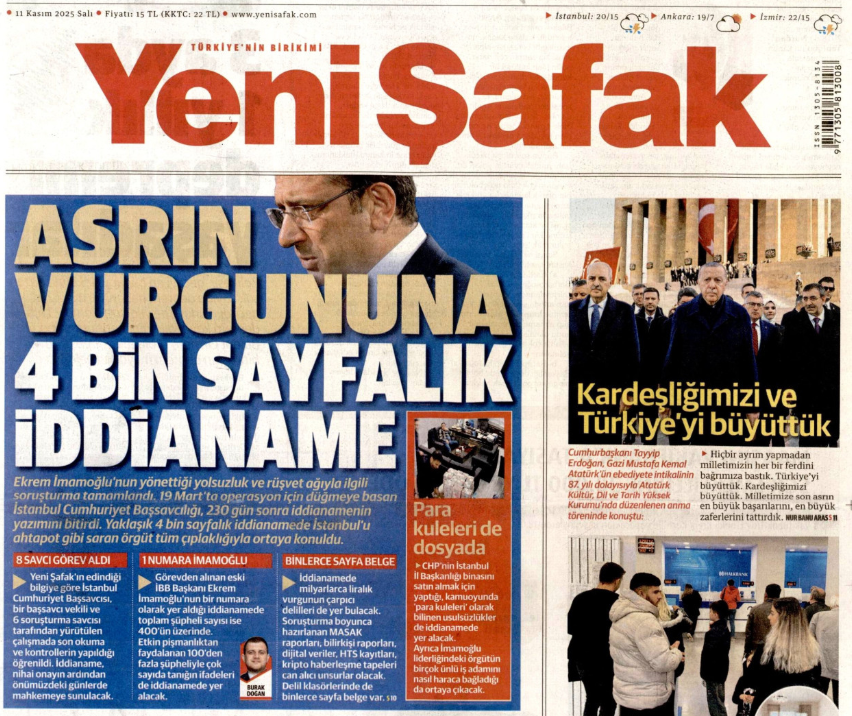 İstanbul Cumhuriyet Başsavcılığı tarafından İstanbul Büyükşehir Belediyesi (İBB) hakkında yürütülen ve henüz kamuoyuna açıklanmamış olan “yolsuzluk” soruşturmasına dair iddianame, iktidara yakınlığıyla bilinen Yeni Şafak gazetesi tarafından yayımlandı.