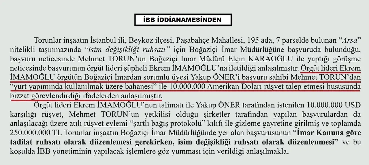 “Örgüt lideri Ekrem İmamoğlu örgütün Boğaziçi İmardan sorumlu üyesi Yakup Öner’i başvuru sahibi Mehmet Torun’dan ‘yurt yapımında kullanılmak üzere bahanesi’ ile 10 milyon Amerikan Doları rüşvet talep etmesi hususunda bizzat görevlendirdiği ifadelerden anlaşılmıştır.”