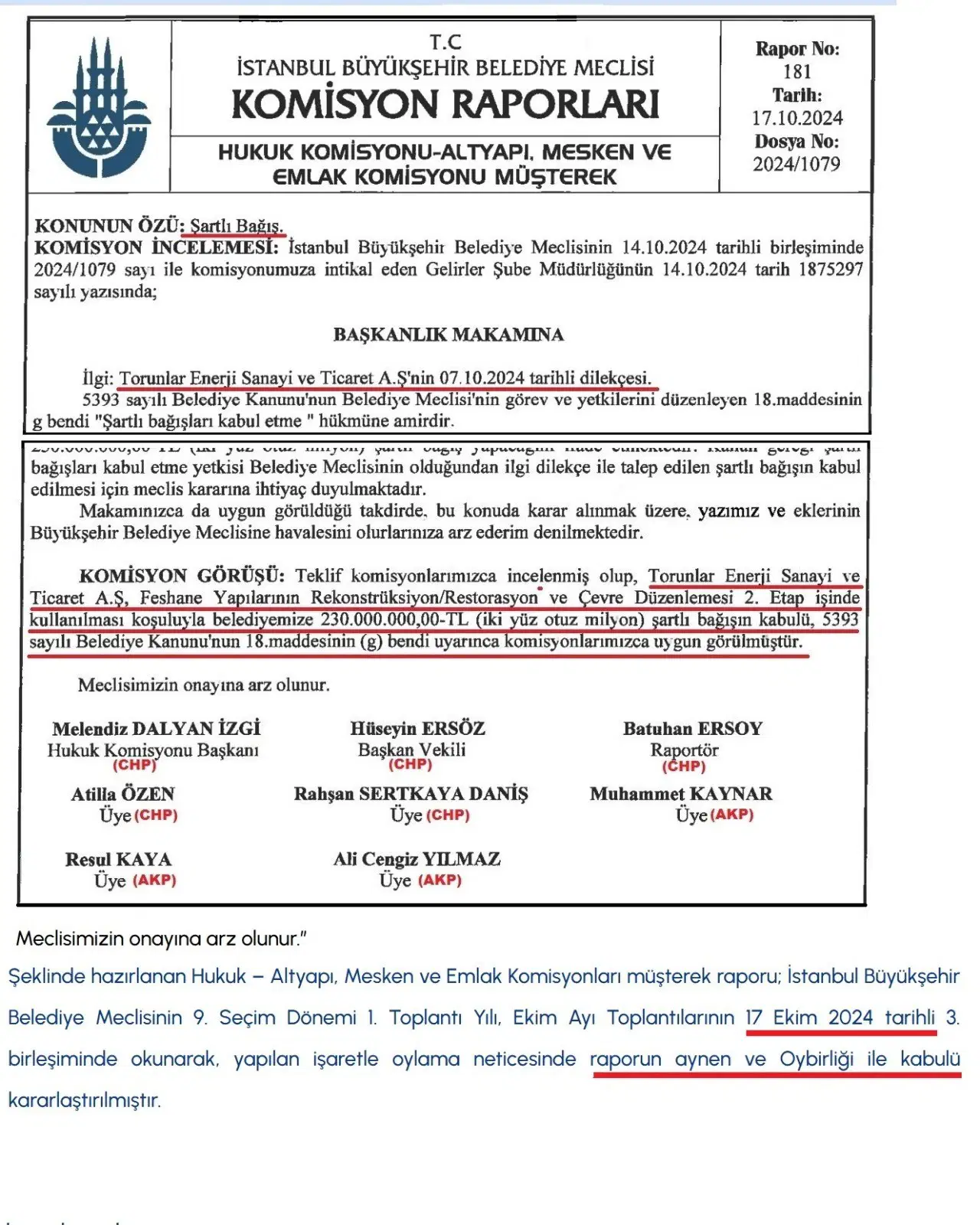 Savcılığın “rüşvet” olarak nitelediği, Torunlar firmasının “Şartlı bağış” teklifi, İBB Meclisi’nin 17 Ekim 2024 tarihli toplantısında görüşüldü. Teklifle ilgili komisyon raporu İBB Meclisi’ne oybirliği gelmişti. Komisyonda 5 CHP’li 3 AKP’li üye bulunuyor. AKP’li üyeler azınlıkta olmalarına karşın, rapora şerh düşebilirdi. Komisyondan oybirliği ile gelen Rapor, Meclis tarafından oybirliği ile kabul edilmişti.