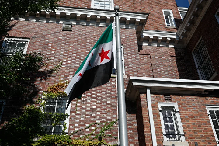 Washington’da 18 Mart 2014’te kapatılan büyükelçilik binasında, ​​​​​​​Suriye Dışişleri Bakanı Esad Hasan Şeybani, Suriye Arap Cumhuriyeti bayrağını göndere çekti.
